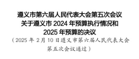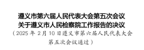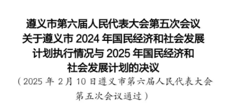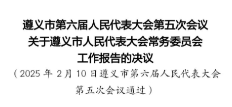 遵义市第六届人民代表大会第五次会议听取和审议了市长黄伟所作的政府工作报告。会议充分肯定市人民政府过去一年的工作,同意报告提出的2025年主要目标任务,决定批准这个报告。 会议号召,全市各族人民要更加紧密地团结在以习近平同志为核心的党中央周围,以习近平新时代中国特色社会主义思想为指导,在中共遵义市委坚强领导下,全面贯彻党的二十大和二十届二中、三中全会精神及中央经济工作会议精神,深入贯彻习近平总书记关于贵州工作重要讲话重要指示精神,更加自觉衷心拥护“两个确立”、忠诚践行“两个维护”,按照省委十三届五次全会、六次全会暨省委经济工作会议和市委六届九次全会、十次全会暨市委经济工作会议部署要求,坚持稳中求进工作总基调,完整准确全面贯彻新发展理念,服务融入新发展格局,坚持以高质量发展统揽全局,守好发展和生态两条底线,坚持围绕“四新”主攻“四化”主战略和“四区一高地”主定位,牢牢把握“伟大转折地”历史地位和“省域副中心”战略定位,大力弘扬遵义会议精神,坚决扛起“六大使命任务”,持续推动“三个重塑”,大力提振消费,提高投资效益,突出大抓产业、大抓项目、大抓招商,推动科技创新和产业创新融合发展,加快构建现代化产业体系,进一步全面深化改革、扩大对外开放,更好激发活力、稳定预期、防范风险,不断提高人民生活水平,完成“十四五”规划目标任务,为实现“十五五”良好开局打牢坚实基础,加快建设省域副中心,奋力谱写中国式现代化遵义篇章! 遵义市第六届人民代表大会第五次会议听取和审议了市人大常委会主任何薇所作的工作报告。会议充分肯定市人大常委会过去一年的工作,同意报告提出的2025年主要任务,决定批准这个报告。 会议要求,市人大常委会要在中共遵义市委坚强领导下,坚持以习近平新时代中国特色社会主义思想为指导,深入学习贯彻习近平法治思想、习近平总书记关于坚持和完善人民代表大会制度的重要思想,深入学习贯彻习近平总书记关于贵州工作重要讲话重要指示精神,全面贯彻落实党的二十大和二十届二中、三中全会精神以及省委十三届五次全会、六次全会暨省委经济工作会议和市委六届九次全会、十次全会暨市委经济工作会议精神,深刻领悟“两个确立”的决定性意义,增强“四个意识”、坚定“四个自信”、做到“两个维护”,坚持党的领导、人民当家作主、依法治国有机统一,深入践行和发展全过程人民民主,聚焦全市中心大局依法履职、担当作为,稳中求进推动新时代地方人大工作高质量发展,为进一步全面深化改革、加快建设省域副中心、奋力谱写中国式现代化遵义篇章作出人大新贡献! 遵义市第六届人民代表大会第五次会议听取和审议了市中级人民法院院长卢飏所作的工作报告。会议充分肯定市中级人民法院过去一年的工作,同意报告提出的2025年工作思路,决定批准这个报告。 会议要求,市中级人民法院要在中共遵义市委坚强领导下,坚持以习近平新时代中国特色社会主义思想为指导,深入学习贯彻习近平法治思想,深入学习贯彻习近平总书记关于贵州工作重要讲话重要指示精神,全面贯彻落实党的二十大和二十届二中、三中全会精神以及省委十三届五次全会、六次全会暨省委经济工作会议和市委六届九次全会、十次全会暨市委经济工作会议精神,衷心拥护“两个确立”、忠诚践行“两个维护”,忠实履行宪法法律赋予的职责,为大局服务、为人民司法,促进更高水平平安遵义、法治遵义建设,为加快建设省域副中心、奋力谱写中国式现代化遵义篇章作出新的更大贡献! 遵义市第六届人民代表大会第五次会议听取和审议了市人民检察院代理检察长朱兴所作的工作报告。会议充分肯定市人民检察院过去一年的工作,同意报告提出的2025年工作安排,决定批准这个报告。 会议要求,市人民检察院要在中共遵义市委坚强领导下,坚持以习近平新时代中国特色社会主义思想为指导,深入学习贯彻习近平法治思想,深入学习贯彻习近平总书记关于贵州工作重要讲话重要指示精神,全面贯彻落实党的二十大和二十届二中、三中全会精神以及省委十三届五次全会、六次全会暨省委经济工作会议和市委六届九次全会、十次全会暨市委经济工作会议精神,衷心拥护“两个确立”、忠诚践行“两个维护”,忠实履行宪法法律赋予的职责,高质效办好每一个案件,持续深入推进检察工作现代化,为加快建设省域副中心、奋力谱写中国式现代化遵义篇章作出新的更大贡献! 遵义市第六届人民代表大会第五次会议审查了市人民政府提出的《遵义市2024年国民经济和社会发展计划执行情况与2025年国民经济和社会发展计划草案的报告》及2025年国民经济和社会发展计划草案,同意遵义市人民代表大会财政经济委员会的审查结果报告。会议决定,批准《遵义市2024年国民经济和社会发展计划执行情况与2025年国民经济和社会发展计划草案的报告》,批准2025年国民经济和社会发展计划。 遵义市第六届人民代表大会第五次会议审查了市人民政府提出的《遵义市2024年预算执行情况和2025年预算草案的报告》及2025年市本级预算草案,同意遵义市人民代表大会财政经济委员会的审查结果报告。会议决定,批准《遵义市2024年预算执行情况和2025年预算草案的报告》,